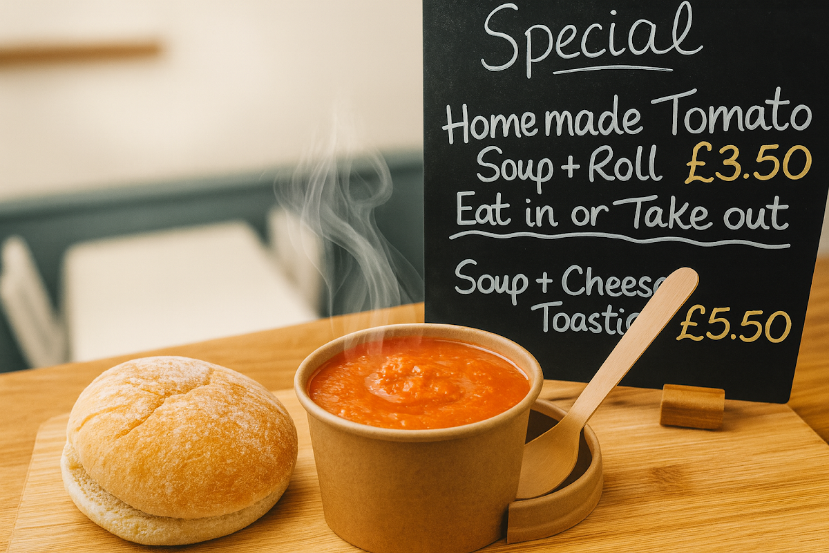 Breakfast selections include traditional and farmhouse-style dishes as well as convenient breakfast rolls, providing a range of choices for those seeking a hearty start to the day.